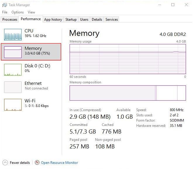 Under Performance tab you will see the graphical view of your CPU usage as well as your physical memory usage. If you see you are running out of memory, then it’s time for you to delete the unused files folders or apps, or you can increase your memory size.